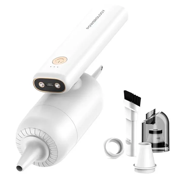 نقدم لكم جهاز Powerology القابل للطي بزاوية 180 درجة، وهو جهاز متعدد الوظائف يعمل بالمكنسة الكهربائية والمنفاخ والنفخ، باللون الأبيض.